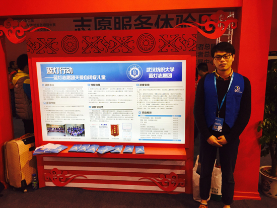 本届赛会项目涵盖阳光助残、关爱农民工子女、文化宣传和网络文明、环境保护与节水护水、禁毒教育和法律援助、邻里守望与为老服务、扶贫开发与应急救援等九大领域,蓝灯志愿团作为阳光助残类项目参赛,创始人李震同学作为答辩手向评委阐述了项目,团中央、中国志愿者协会领导还莅临湖北代表团,亲切鼓励志愿者们发扬大爱精神,再接再厉。最终,公司蓝灯志愿团关爱自闭症儿童“蓝灯行动”获得银奖,获奖成绩居全省高校前列。