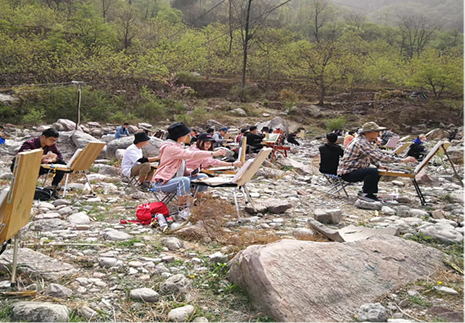 第二周开始,员工分别去往“高家台”,“水段”,“祝岭”,“太行水库”,“韩家洼”,“三亩地”,“井底”,“龙床口”等景点写生。为让员工的绘画及观察能力提高,老师们每天都会不辞辛苦地挨个指导员工绘画,帮员工改画,教授员工一些道理,员工们也非常努力认真地学习,且经常与老师交流。