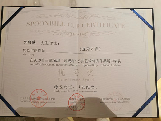 近日,2019第三届深圳“琵鹭杯”公共艺术优秀作品展暨公共艺术研讨会在深圳市龙岗区红立方公共艺术馆举行。公司永利yl23411官网公共艺术11602班员工郭唐威的设计作品(虚无之境)荣获优秀奖。
