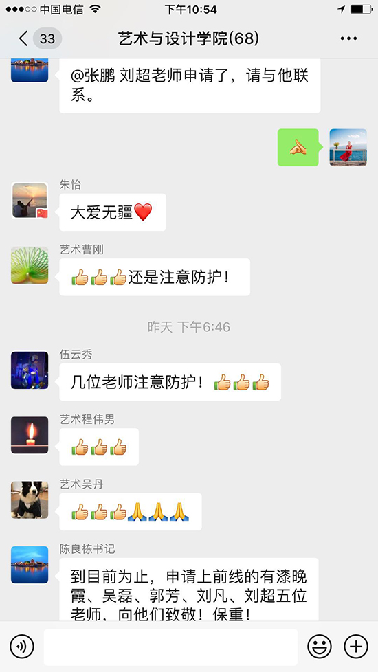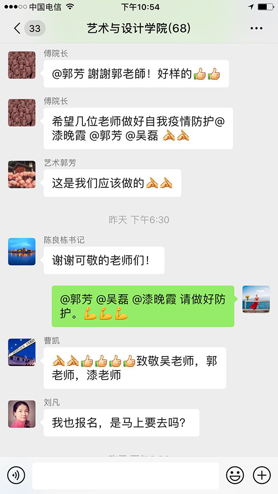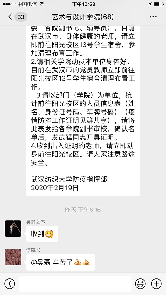 当前,正值新型冠状病毒感染肺炎疫情防控工作的关键时期。这是万众一心、众志成城战疫情的关键时刻,越是在这样的紧急关头、非常时期,越要彰显出我们党组织和党员的先锋作用。2月18日,公司接武汉市新型肺炎防控指挥部通知,阳光校区将按要求准备提供1000个房间作为储备隔离点。2月19日晚,公司发布紧急通知。艺术与设计公司党委在收到通知后,通过微信群、QQ群、电话等方式传达动员。通知一经发出,公司经理助理刘凡教授、公司党委委员刘超副教授、公司教工支部书记郭芳老师、员工支部书记漆晚霞老师、实验室吴磊老师等五名老师主动报名、积极响应,第一时间赶到阳光校区。让我们为他们点赞!